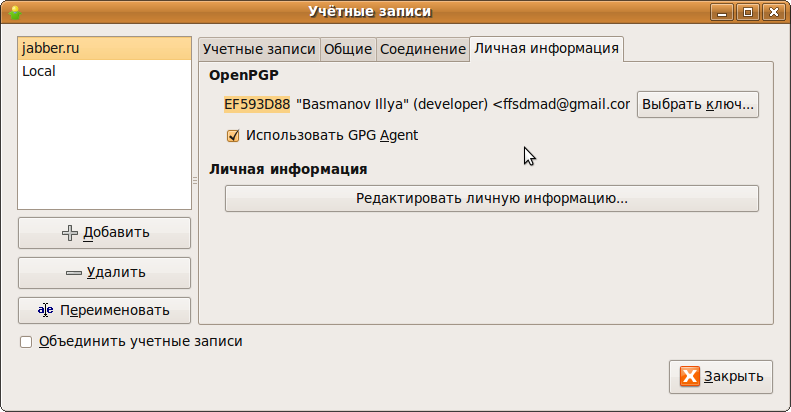 В Gajim заходим в настройки акаунта -> личная информация, выбираем созданный GPG ключ и можно включить агента, который во время сессии будет помнить ваш пасскей