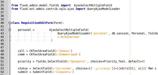 тут я включаю в форму поле personal как объект класс AjaxSelectMultipleField, которой расширяется с помощью объекта класс QueryAjaxModelLoader.